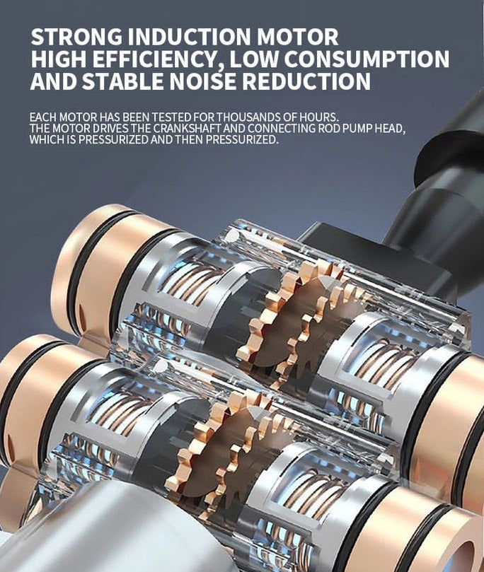 The high-capacity lithium-ion battery provides 30–60 minutes of continuous use, depending on the pressure setting. It fully recharges in 2–4 hours.